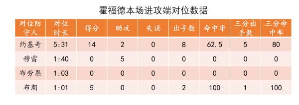 上表是霍福德本场在进攻端面对掘金不同防守人时的对位数据,可以看到在对位约老师的5分31秒钟内、霍福德8次出手便得到了14分,其中三分球5投4中,完美展现出射手内线对蹲坑型中锋的克制。