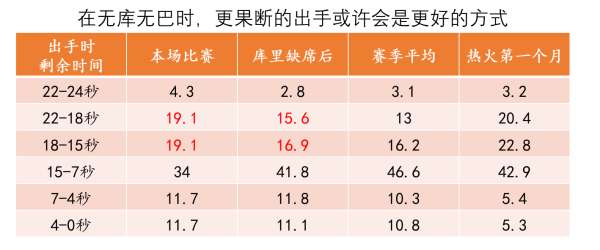 上表我统计了勇士出手时不同剩余时间的投篮比例分布,可以看到本场比赛球队在还剩18~22秒时出手比例高达19.1%。而赛季平均仅仅只有13%。剩余时间有15~18秒的出手比例同样为19.1%,高出赛季平均很多,体现出了球员们的坚决性和活力。