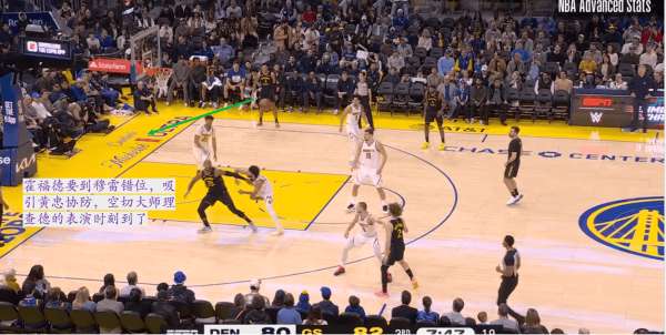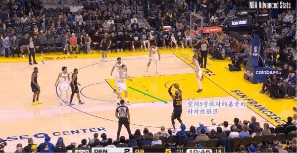 比如上图就是一个典型的霍福德抓穆雷错位的案例,这同时也是勇士五外阵容的威力体现。此时由于约基奇不敢直接对位霍福德,于是他选择了对位勇士场上5人中三分产量最低的斯潘塞,但也因此远离了护框位置,而留在护框位置的黄忠面对霍福德打穆雷的错位被迫过来协防帮忙,这就给了空切大师理查德充分的表演机会。