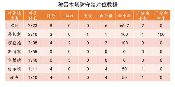 上表是掘金队穆雷本场比赛在防守端的对位数据,可以看到被勇士球员欺负得太惨,主要对位人除斯潘塞外剩下球员都能完成高效率得分或助攻。