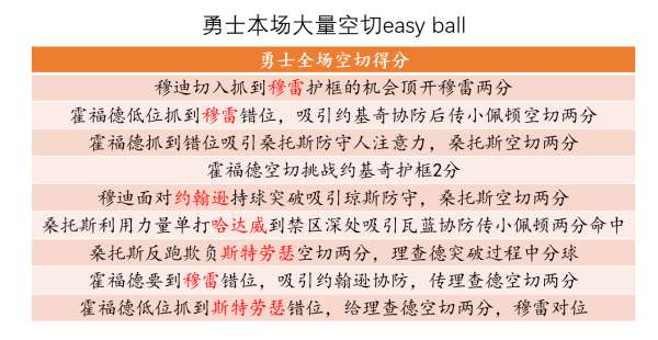 全场比赛勇士光是通过空切便得到了18分之多,且大部分的起手式都是要到了大打小的错位机会吸引协防后完成的。其中霍福德完成了4次空切助攻、桑托斯靠本赛季大幅增强的力量单打欺负哈达威吸引协防助攻空切的小佩顿,穆迪也能欺负穆雷和哈达威的防守。