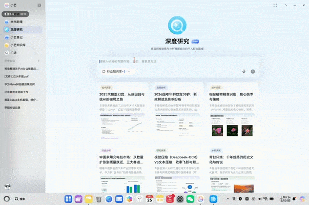 HarmonyOS 6带来的小艺深度研究(PC)智能体,是具备深度搜索与分析推理能力的超级个人助理。只需提出一个模糊的研究目标,小艺深度研究便能自主完成在线知识搜索、数据分析、观点提炼,自动生成专业的研究文档、研究报告、商业计划书等。在20分钟左右完成过去需要耗费数日的工作量。