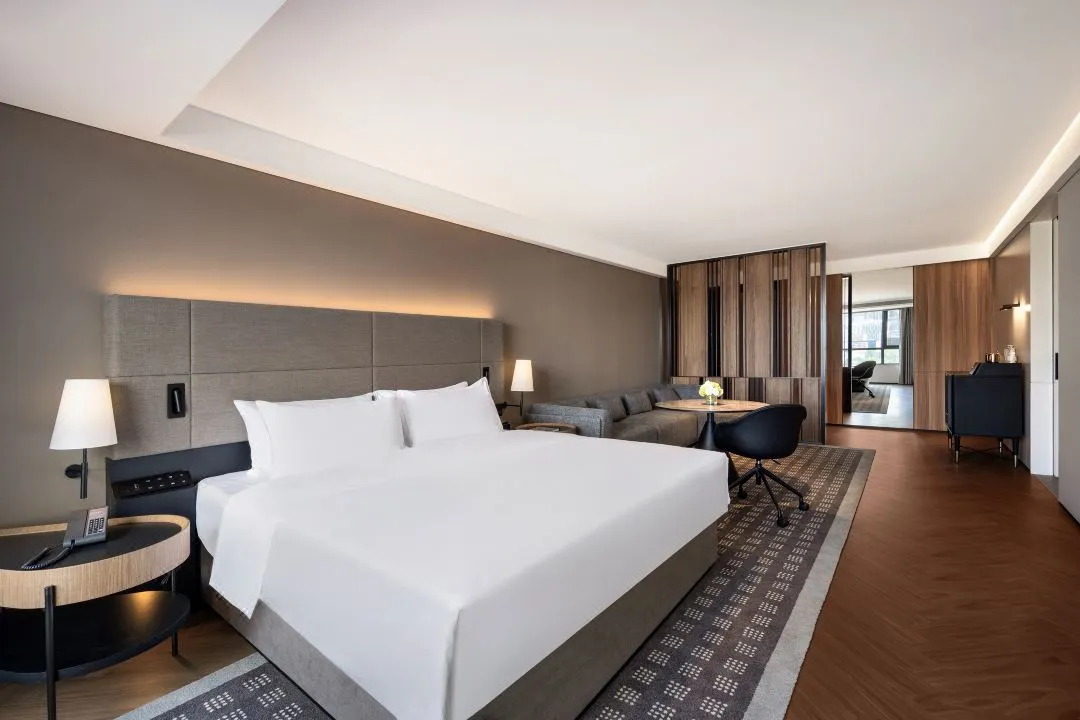 推开客房门的瞬间,就像打开一个高定西装的内衬口袋:270度无折角包床,让“躺下即盖被”的动线极致丝滑,静音滑轨抽屉关闭时确保最后几公分贴心减速,连灯光都被精心规划过。