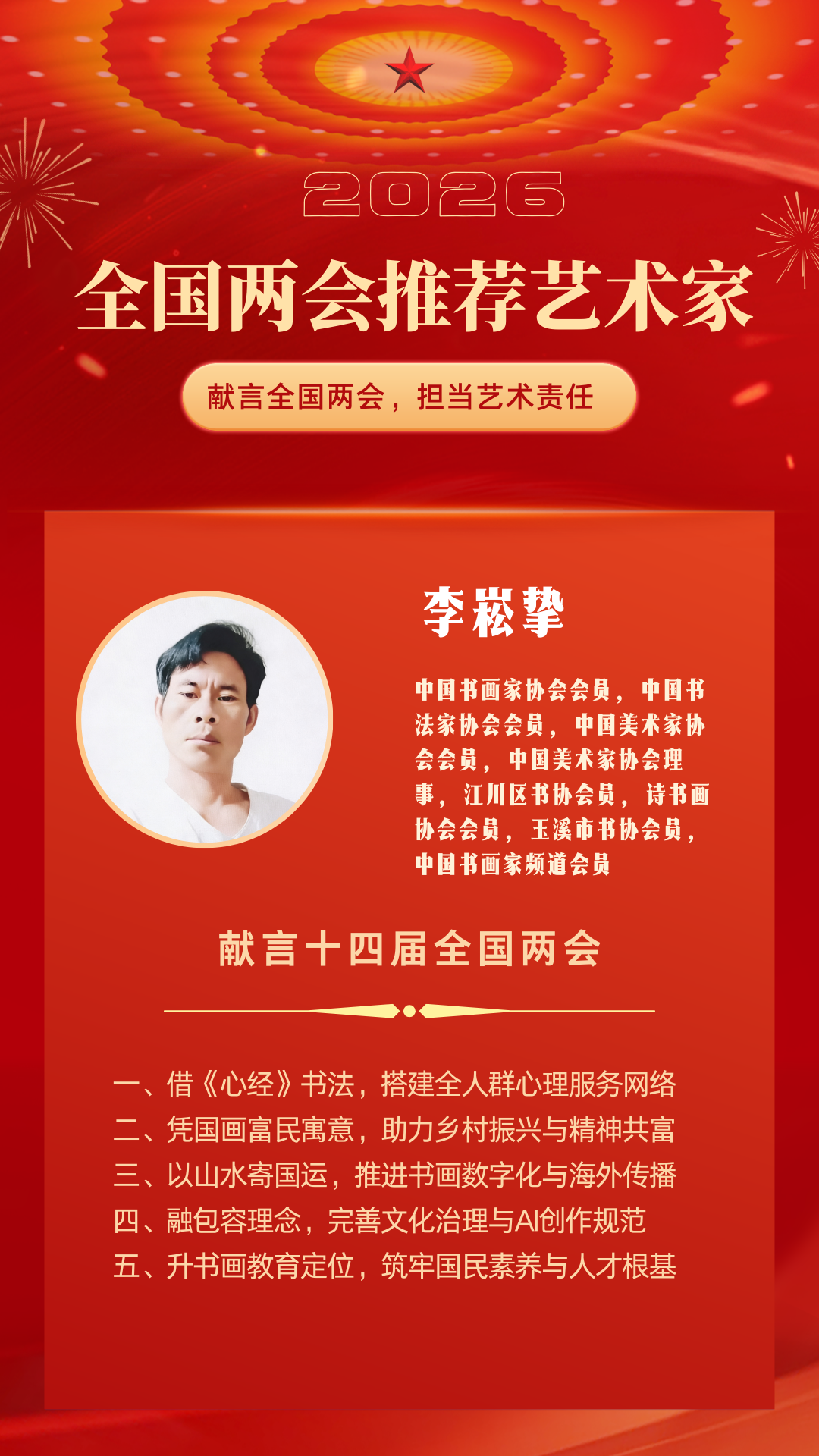 当全国两会的春风吹遍神州,文化传承、教育发展与社会治理再度成为时代焦点。在这场共商国是的盛会中,一位来自云南玉溪的书画家,以承载着东方智慧的作品为引,献上了一份兼具温度与深度的建言。他就是李崧挚,笔名青松,一位从滇中大地走出,以笔墨为犁、以丹青为翼的艺术践行者。从个人创作到为时代发声,他用半生坚守,诠释着“为天地立心,为生民立命”的文人担当。