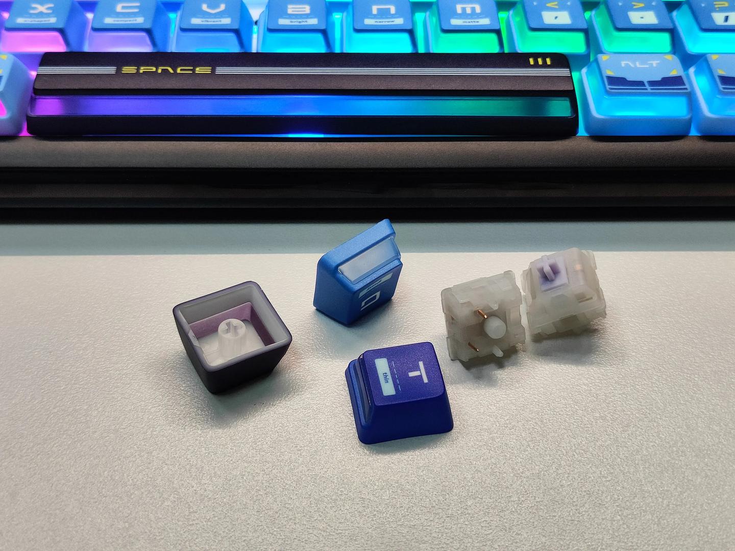 拆开包装后第一时间发现,配件给得很全:键盘、Type-C 数据线、拔轴器、说明书一套配齐。其实当时第一眼就被玄影款的颜值戳中了,科幻主题配色搭配原厂高度的L型半透PBT键帽,个性十足。