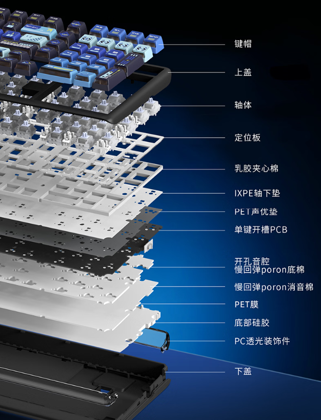 采用的 Gasket 结构,再加上 7 层满配填充:乳胶夹心棉、ixpe 轴下垫、PET 声优垫这些全给配齐了,堆料确实好不手软。敲下去的手感软弹又扎实,像按在软乎乎的海绵上,但又不会缺少反馈。