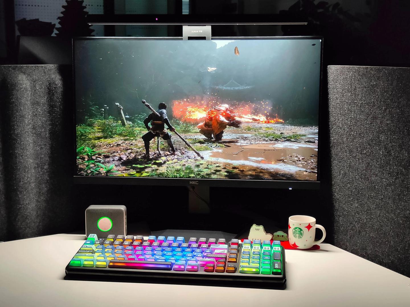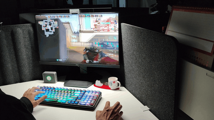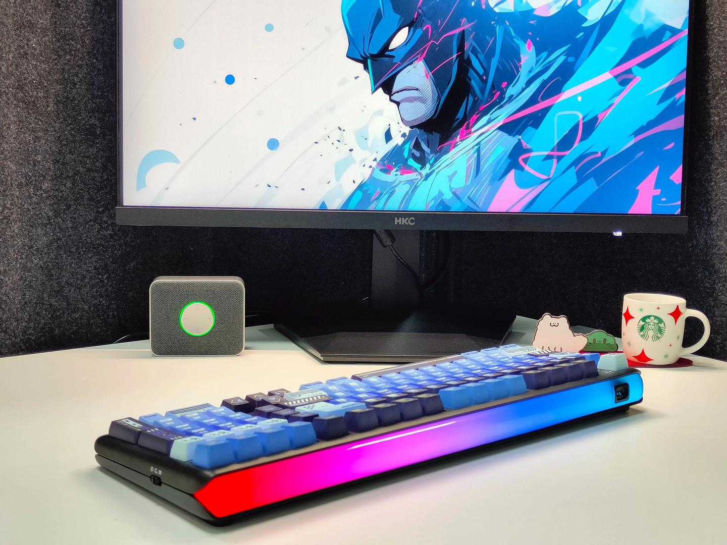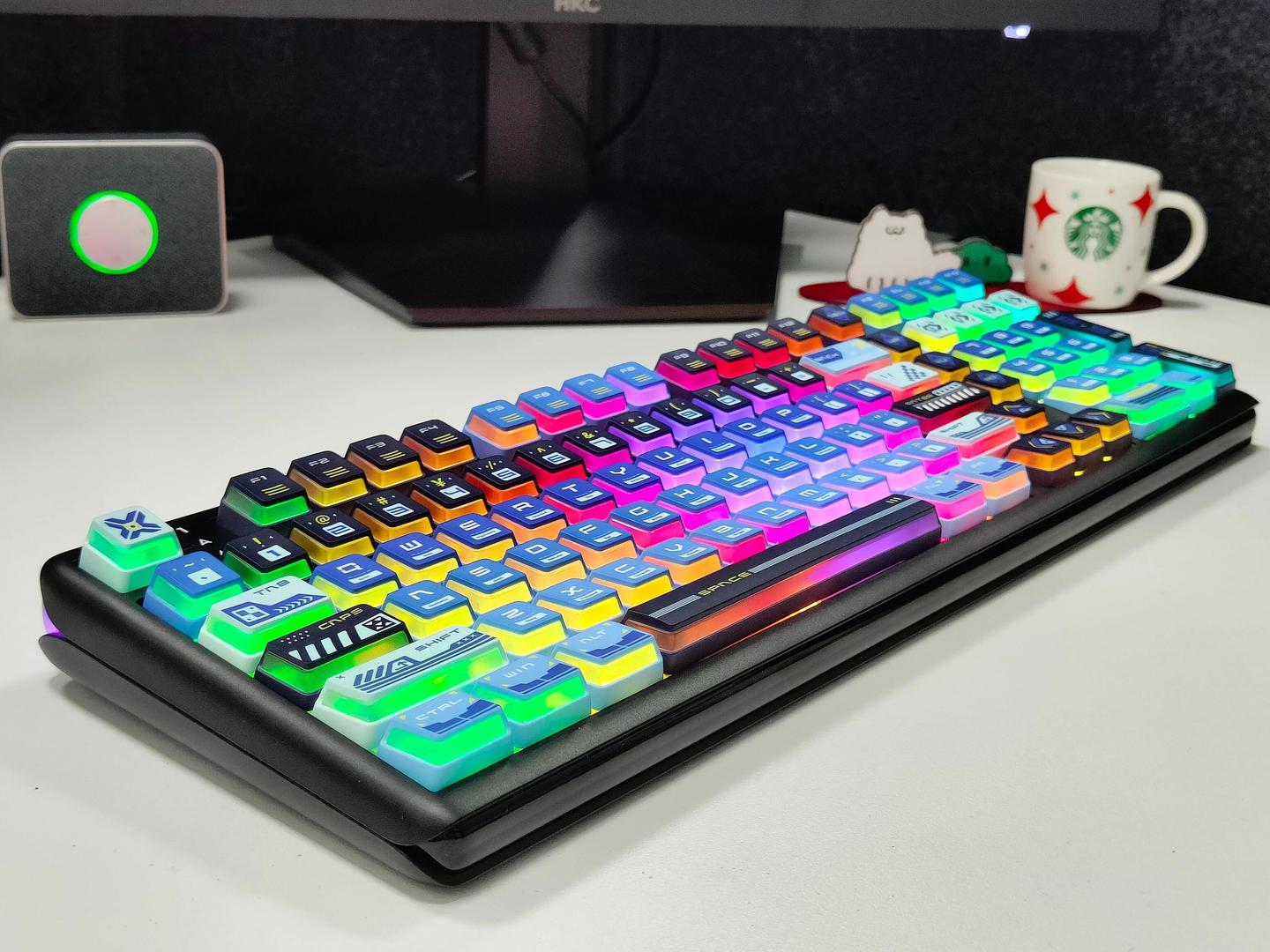 开机瞬间就有灯光秀,RGB 灯光从键帽和灯箱一起透出来,瞬间把桌面氛围感拉满。自带 20 种高级灯效,不管是办公听的歌还是游戏 BGM,灯光都能跟着节奏晃,像在蹦迪一样,晚上关了灯玩游戏,整个桌面直接变身电竞战场。
