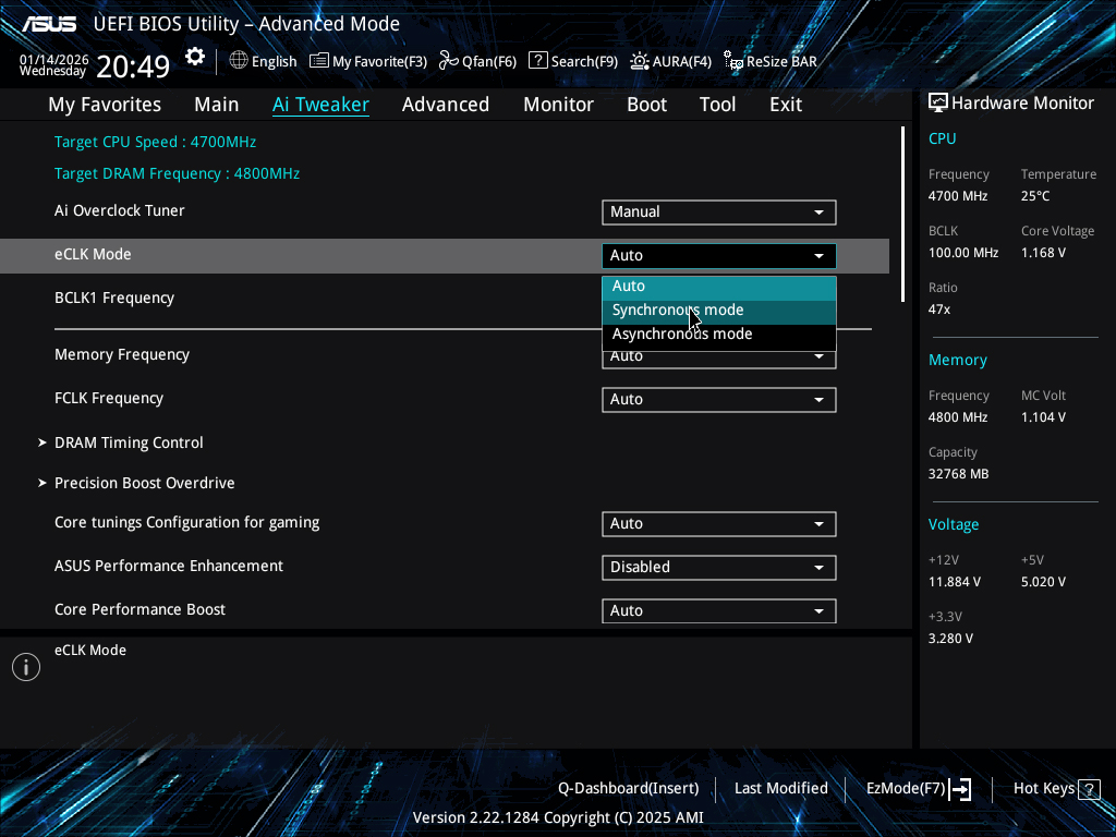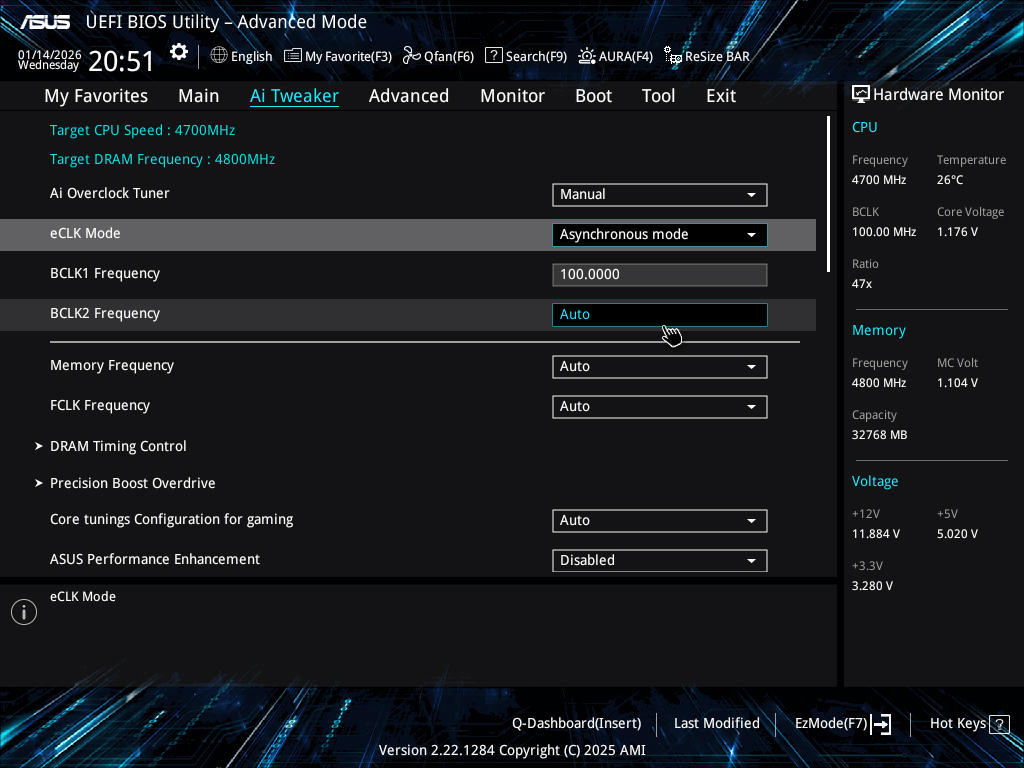 更惊喜的是,主板具备异步时钟超外频功能,开启Manusl选项后,可在eCLK Mode中选择异步模式,通过BCLK 2选项单独调节CPU基础频率,这一功能在同级别主板中极为罕见。
