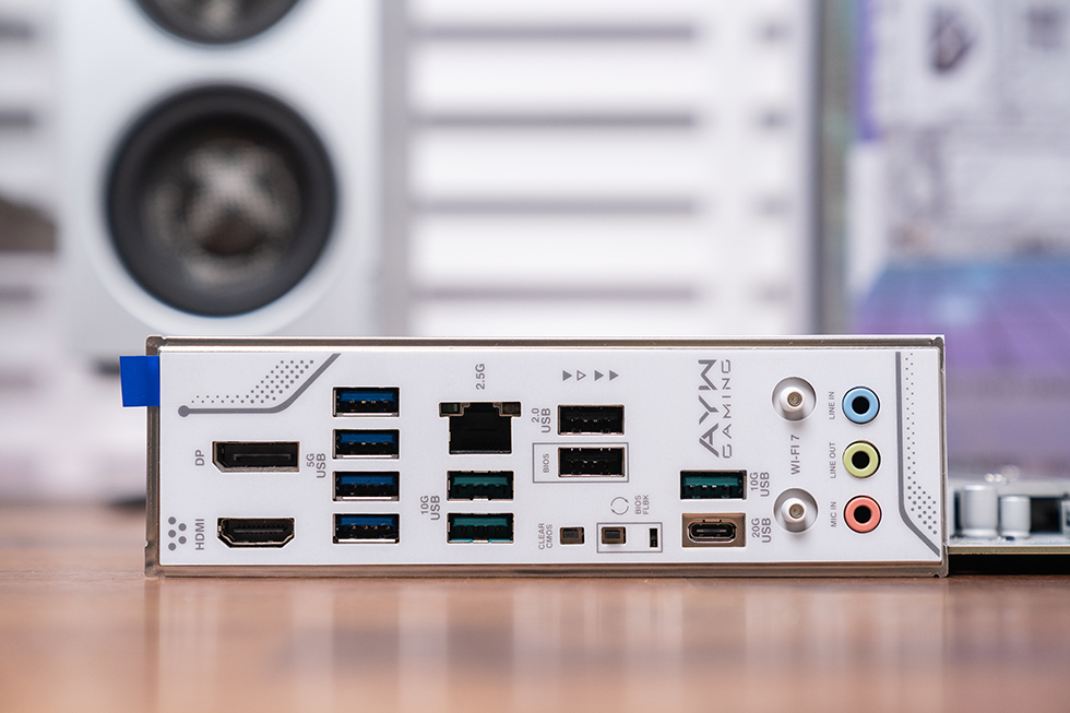 后置I/O接口丰富,包括1个USB 3.2 20Gbps Type-C、3个USB 3.1 10Gbps Type-A、4个USB 3.0 5Gbps Type-A、2个USB 2.0、1个2.5Gb LAN、1个HDMI 2.1、1个DP 1.4及3个3.5mm音频接口,同时标配BIOS FlashBack和Clear CMOS按键,支持无U刷BIOS。网络方面搭载联发科MT7925 WiFi7无线网卡(支持160MHz频宽)和瑞昱RTL8125D 2.5Gb有线网卡,蓝牙5.4,满足高速网络需求。