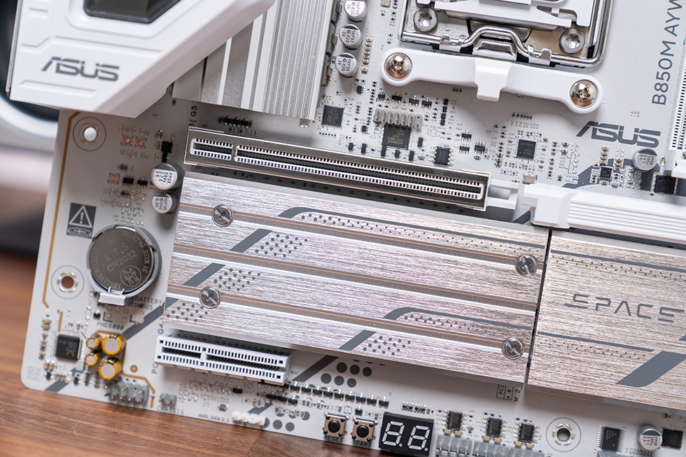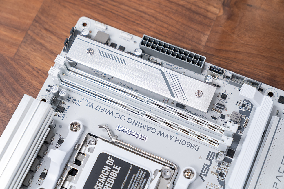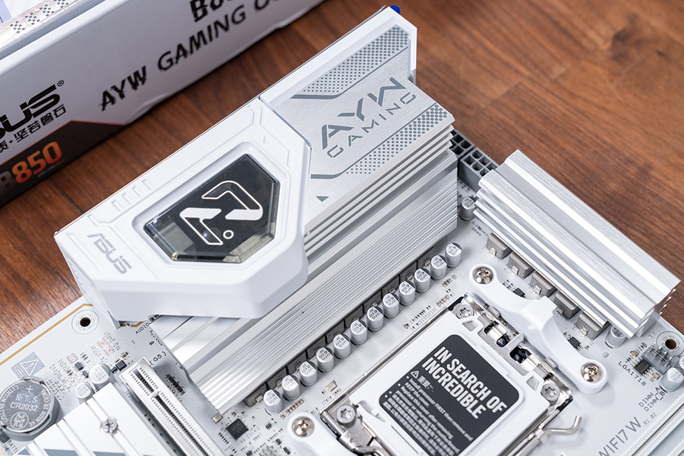 做工方面,主板延续了华硕一贯的严谨风格。VRM散热区域采用L型布局与双散热片设计,表面辅以金属拉丝工艺并印有AYW GAMING系列logo,散热片截面大段开槽,配合芯片组散热片形成立体散热通道,既保证散热效率,又提升了质感。M.2散热片同样采用金属拉丝工艺,手感扎实光滑,完全没有割手的情况。