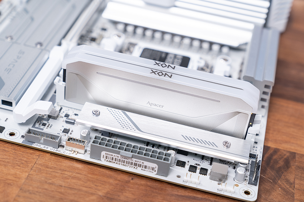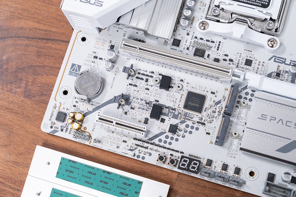 华硕B850M AYW GAMING OC WIFI7 W采用标准M-ATX版型(245x245mm),专为中小型机箱设计,完美适配当下流行的纯白海景房装机风格。主板采用白色PCB搭配银白色散热片,连内存插槽也采用浅色设计,“白得更彻底”,同时内存和显卡插槽均做了银色加固处理,兼顾颜值与耐用性。
