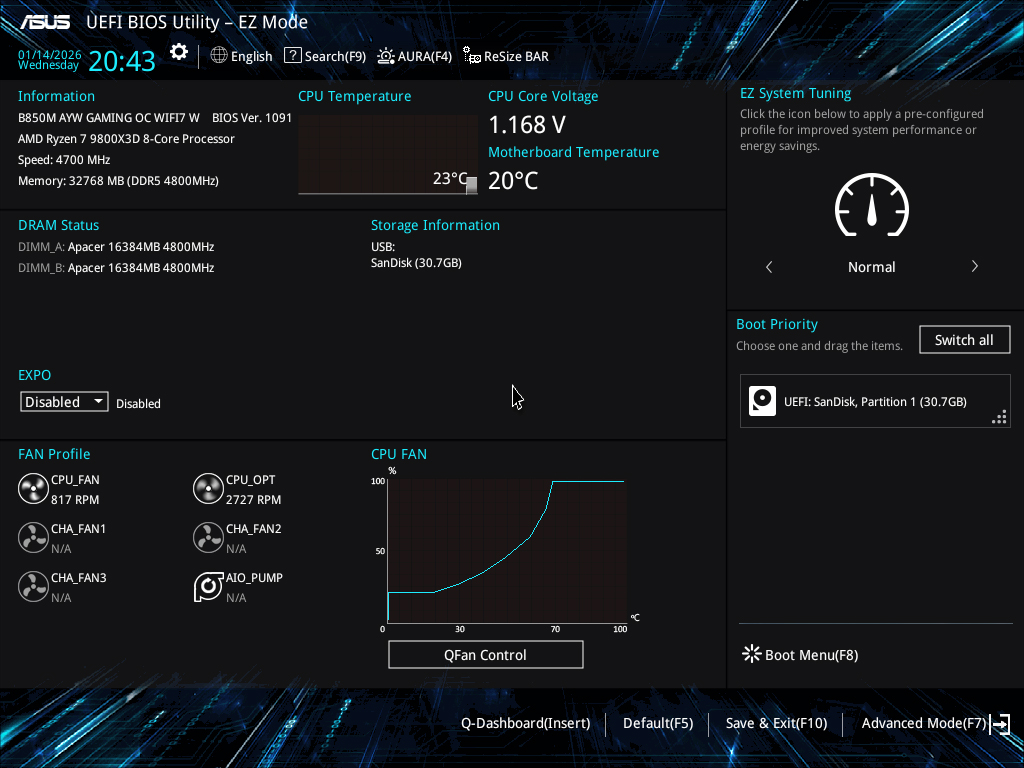 主板的性能释放与BIOS优化息息相关,B850M AYW GAMING OC WIFI7 W配备大容量 BIOS 芯片不仅支持功能更强大的界面,还扩展了对最新及未来 AM5 处理器的兼容性,从而确保流畅、无缝的用户体验。BIOS界面延续了华硕经典风格,功能全面,兼顾新手与发烧玩家。默认进入EZ简易模式,可直观查看BIOS版本、CPU型号、内存容量等核心信息,新手可轻松完成基础设置。