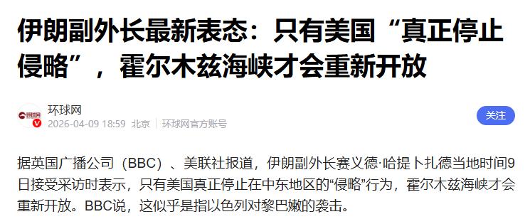 伊朗副外长哈提卜扎德9日接受采访时把话挑明:只有美国真正停止在中东的相关行动,海峡才会重新开放,同时他也强调伊朗会遵守国际准则和国际法,不是要故意管控所有船只,而是要保障能源安全。