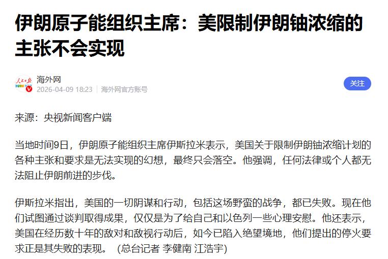除了海峡和黎巴嫩,谈判桌上还有一个死结,伊朗的铀浓缩计划,4月9日伊朗原子能组织主席伊斯拉米公开表态,语气没有半点商量余地。