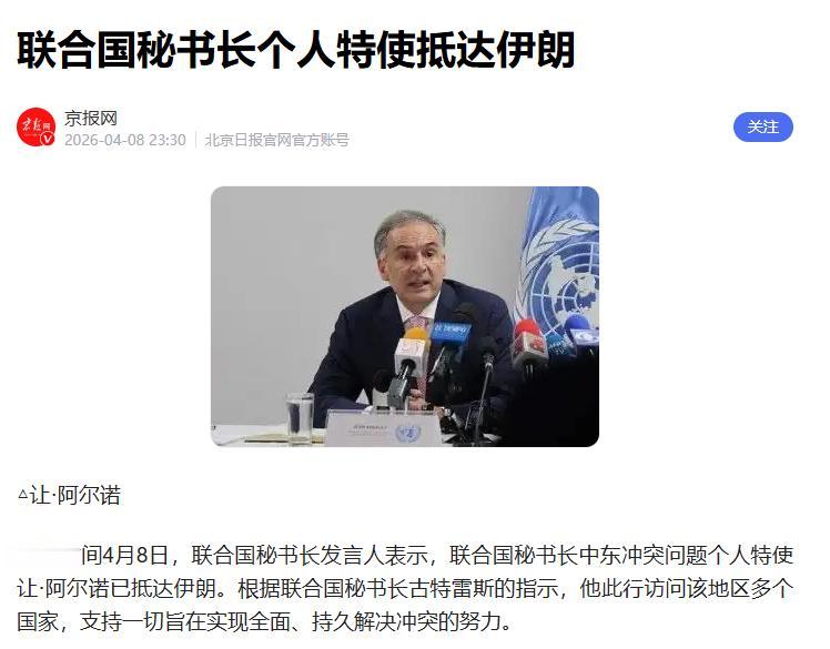 联合国特使紧急赴伊朗,和平斡旋能有用吗?4月8日联合国秘书长中东冲突问题个人特使让・阿尔诺,按照古特雷斯的指示,直接飞抵伊朗,他此行任务很明确:访问地区多个国家,支持一切能推动全面、持久解决冲突的努力。