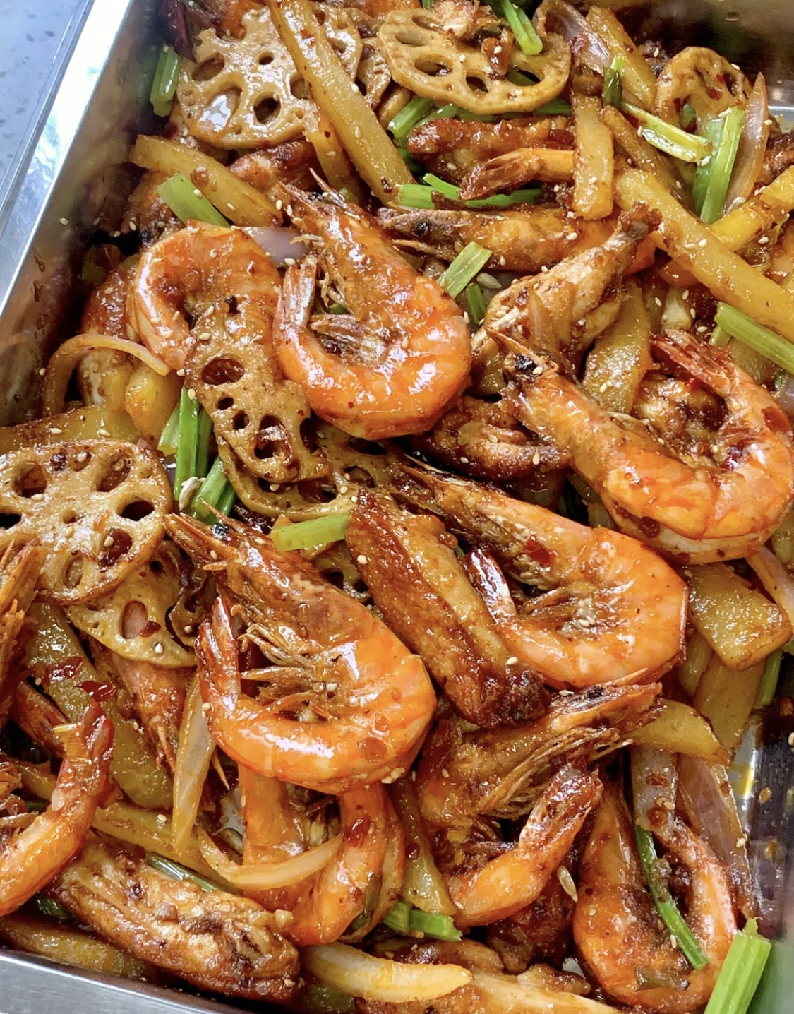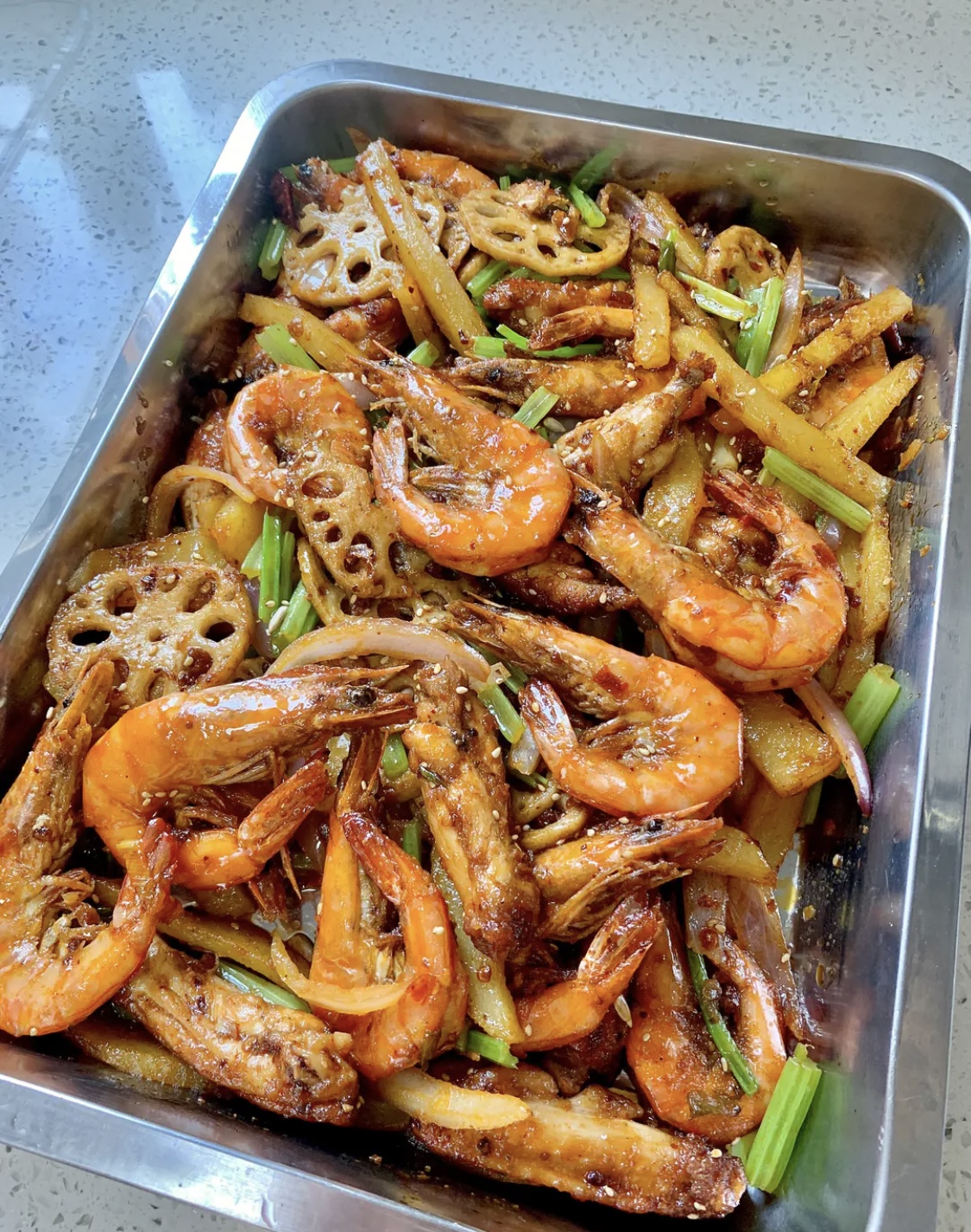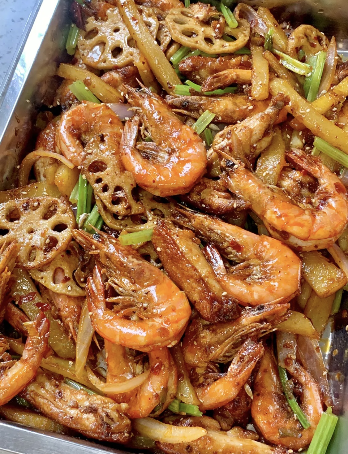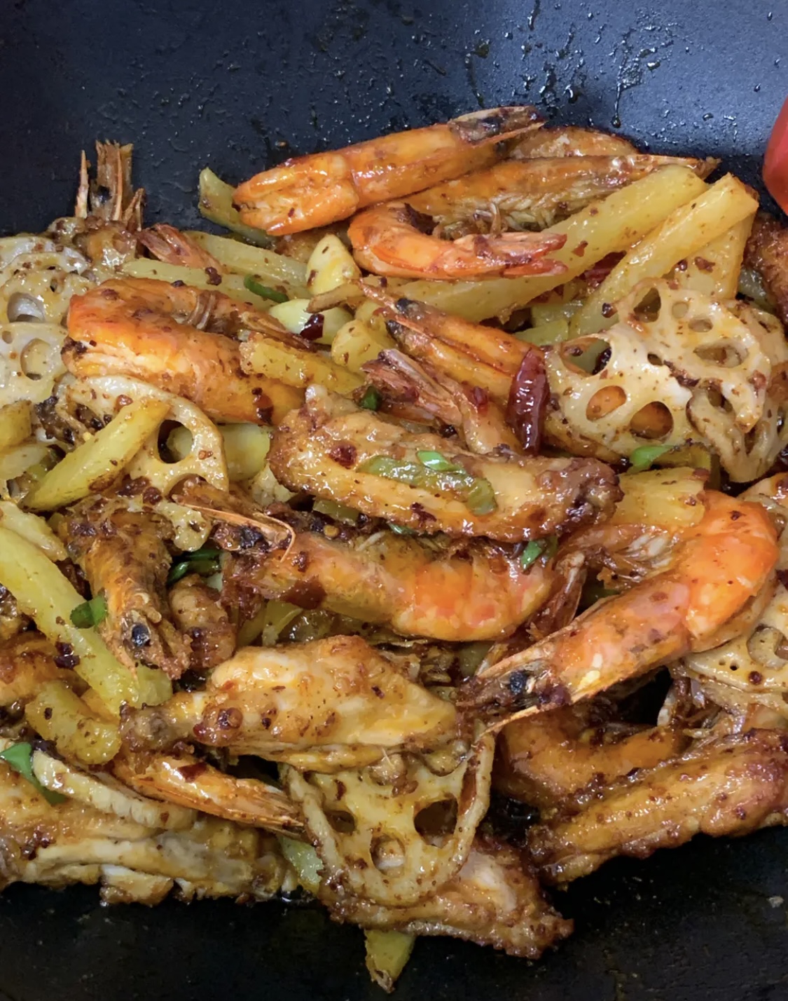 美食的魅力总在独特的搭配中尽显。这道干锅鸡翅香辣虾,鸡翅的香嫩与鲜虾的鲜美完美交融。将它们置于干锅之中,精心烹制,调料的香辣气息丝丝渗入。鸡翅外酥里嫩,咬上一口,香味四溢;鲜虾紧致弹牙,裹满香辣滋味。这道菜是餐桌上不可错过的一道佳肴。