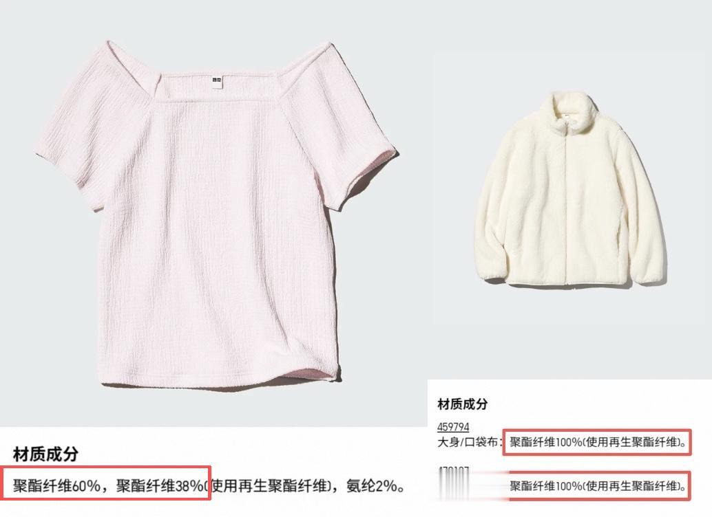 优衣库标价39元的短款上衣,材质成分界面写着聚酯纤维含量60%,再生聚酯纤维含量占38%。卖爆的摇粒绒外套,大身和口袋布的材质是100%聚酯纤维。
