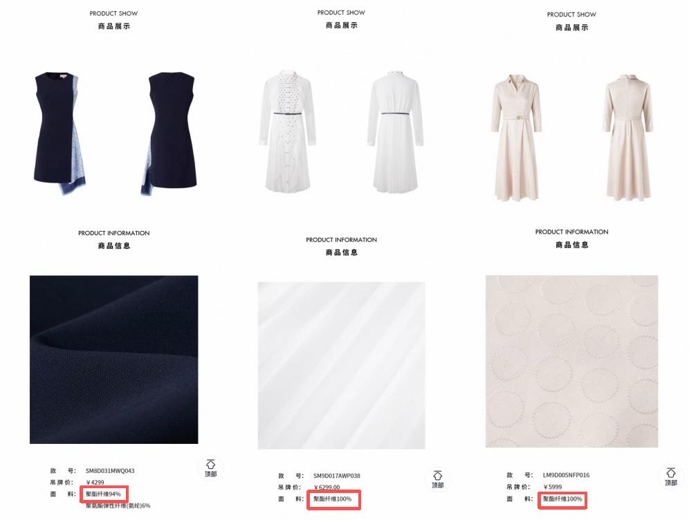 淘宝认证的“老钱品牌女装店铺榜TOP.1”的朗姿,也没“逃过”聚酯纤维。