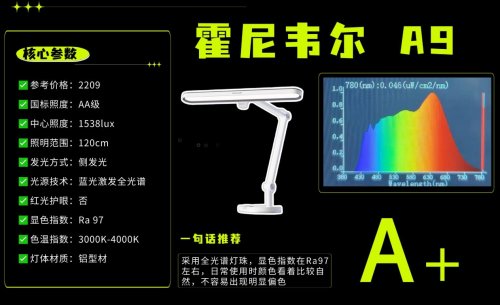 学生护眼灯买什么样的好?霍尼韦尔A9这款护眼台灯采用的是55cm的长灯头,搭配多段可调节灯臂,光线铺得比较开,正常情况下可以覆盖到一张1.2米左右的书桌,孩子写作业、看书或者大人办公都够用。光源采用全光谱灯珠,显色指数在Ra97左右,日常使用时颜色看着比较自然,不容易出现明显偏色。操作方式也比较直观,旋钮加上自动感应的组合,亮度可以根据环境光自动调整,用起来省心一些。不过它的定价在同类产品里偏高一些,整体更适合桌面空间充足、预算相对宽松的家庭选择。
