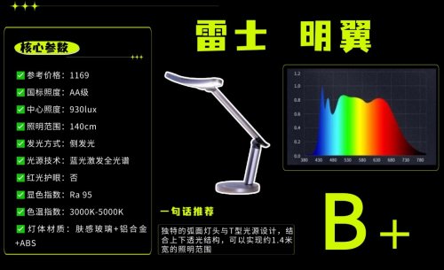 学生护眼灯买什么样的好?雷士明翼护眼台灯采用独特的弧面灯头与T型光源设计,结合上下透光结构,可以实现约1.4米宽的照明范围,光线分布较为均匀,符合国AA级照度标准。它搭载全光谱LED灯珠,显色指数达到Ra95,能较好还原物体真实色彩,并支持3000K至5000K的色温调节。功能上具备入座感应、智能调光、45分钟定时休息提醒及辅助夜灯模式,触控面板集成于灯头,操作较为直观。不过,这款台灯的蓝光峰值接近1.0,虽然符合RG0标准,但缺乏红光增益等进阶护眼功能,长时间使用可能加重视觉疲劳。