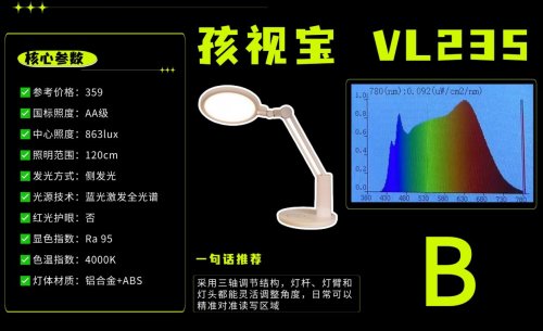 学生护眼灯买什么样的好?孩视宝VL235护眼台灯整体走的是偏实用路线,外观为圆环形灯头搭配较厚的底座,放在书桌上稳定性不错,不容易晃动。灯体采用三轴结构设计,灯杆、灯臂和灯头都可以调节,日常给孩子写作业、看书时,调整角度还算方便。光源方面使用的是全光谱灯珠,日常亮度和显色表现能够满足基本学习需求,看字、看图不会明显偏色。不过它采用的是直发光方式,光线集中度较高,在亮度调高的情况下,光感会偏硬,对光线敏感的孩子可能会觉得略微刺眼。
