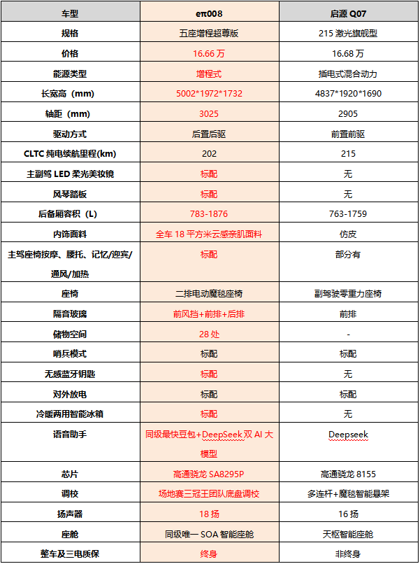 通过对比可以发现,两款车型在设计理念上各有侧重。东风奕派eπ008五座版通过更大的尺寸、电调二排座椅和后排控制屏,强化了后排的乘坐体验;长安启源Q07则突出了前排,尤其是副驾的舒适功能。在技术路径与驾驶感受方面,东风奕派eπ008五座版的增程式后驱布局,与长安启源Q07的插混前驱布局,在动力输出特性、能耗逻辑和驾驶质感上存在区别。并且在相近价格区间内,两款车型在智能硬件、舒适材质和售后保障方面的配置也存在差异。