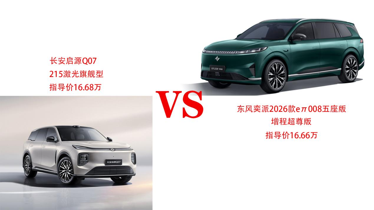 在此背景下,我们聚焦两款热门车型——东风奕派2026款eπ008五座版(增程超尊版,指导价16.66万)与长安启源Q07(215激光旗舰型,指导价16.68万),看看它们在真实的家庭生活场景当中,谁才是20万内真正的“全家乐享之选”。