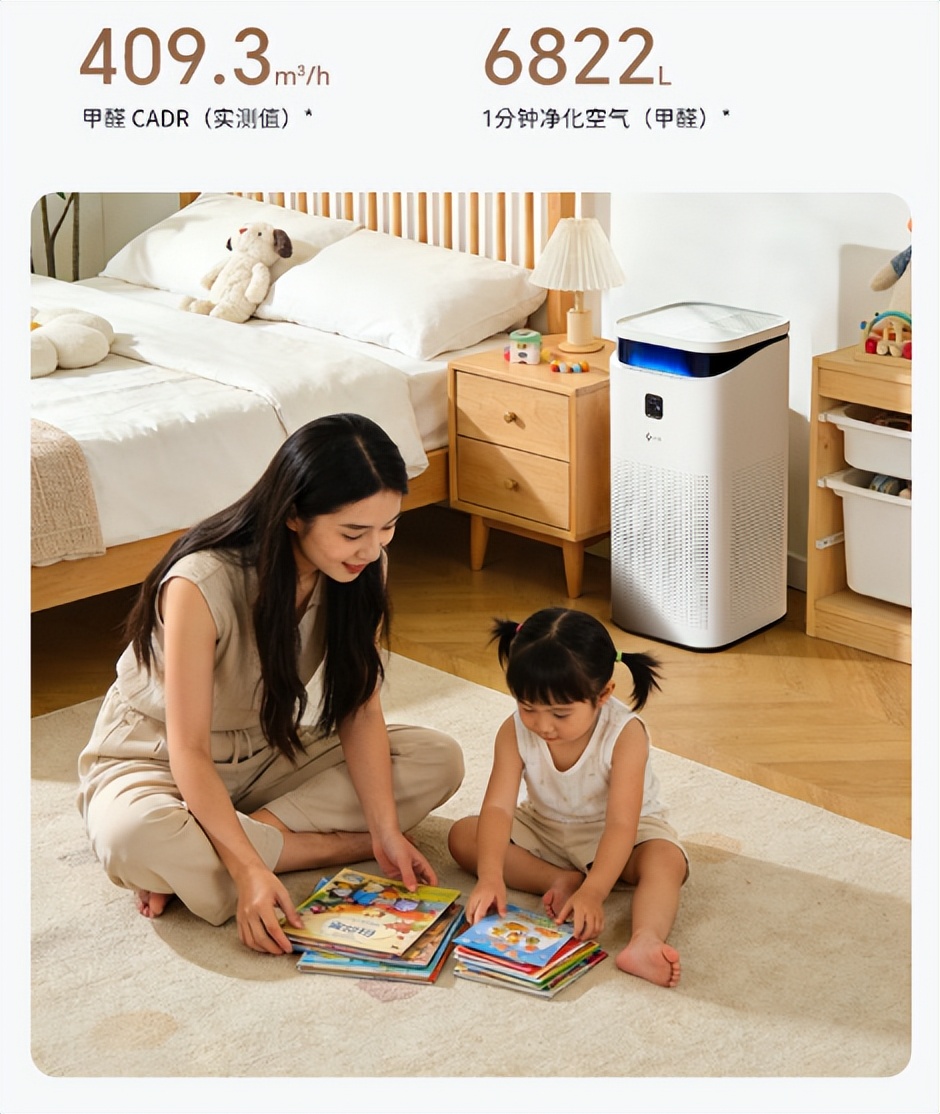 按国标层高2.8米测算,409m³/h的甲醛CADR可覆盖60㎡空间,一居室、小两居单台就能搞定全屋除醛,不用多机拼接,新装修小户型无需纠结适配性,搭配530m³/h颗粒物CADR,还能同步净化装修粉尘,实现一站式空气治理。