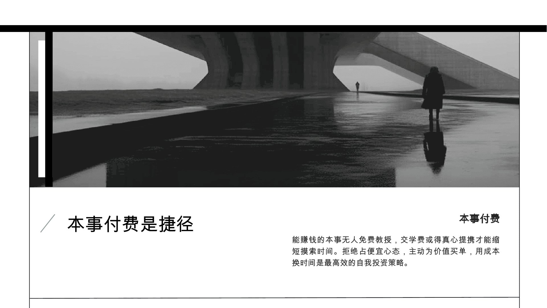 免费的才是最贵的:能赚钱的本事,没人会免费教你 —— 要么交学费拜师,要么遇到真心想帮你的贵人,否则 3 年能成的事,可能要走 5 年弯路。