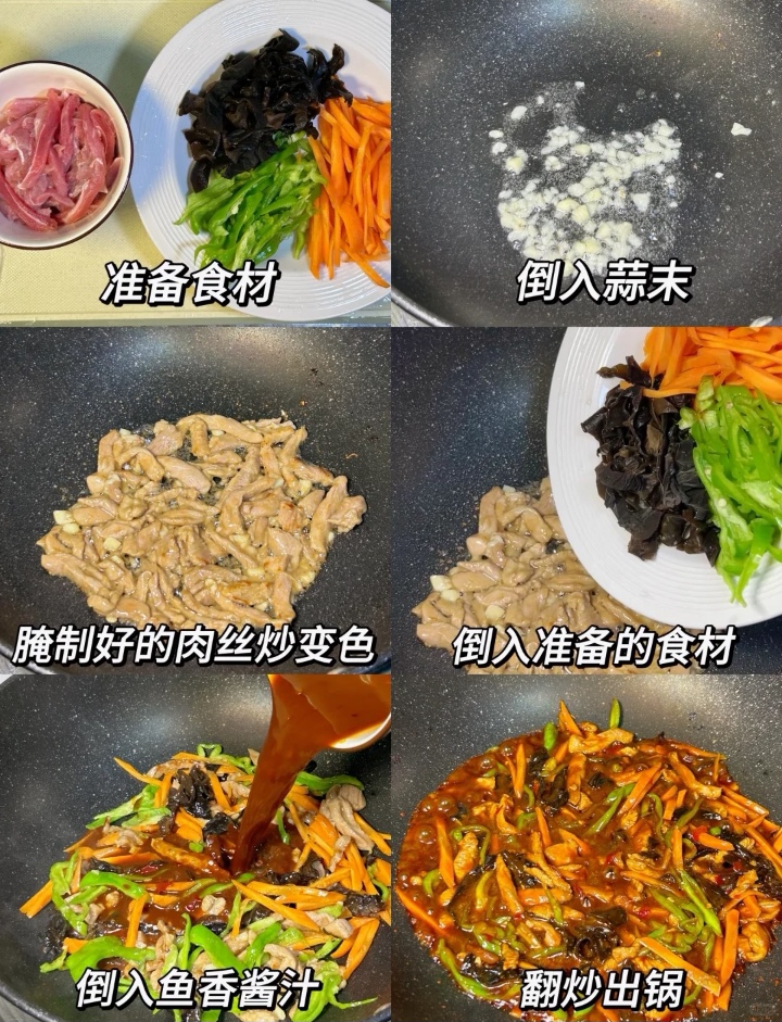烹饪的过程讲究一气呵成。热锅凉油,油温四五成热时下入腌好的肉丝,快速滑散至变色即刻盛出,避免肉质变老。锅中留底油,转小火下入泡椒末、姜蒜末爆香,炒出红油,这一步是鱼香味的来源。随后转大火,倒入配菜丝快速翻炒断生,再倒入滑好的肉丝。此时,将调好的碗芡再次搅拌均匀,淋入锅中,大火收汁。待汤汁变得浓稠,均匀地裹在每一根肉丝和配菜上,撒上葱花,即可出锅。