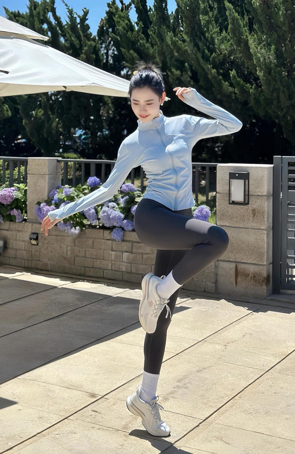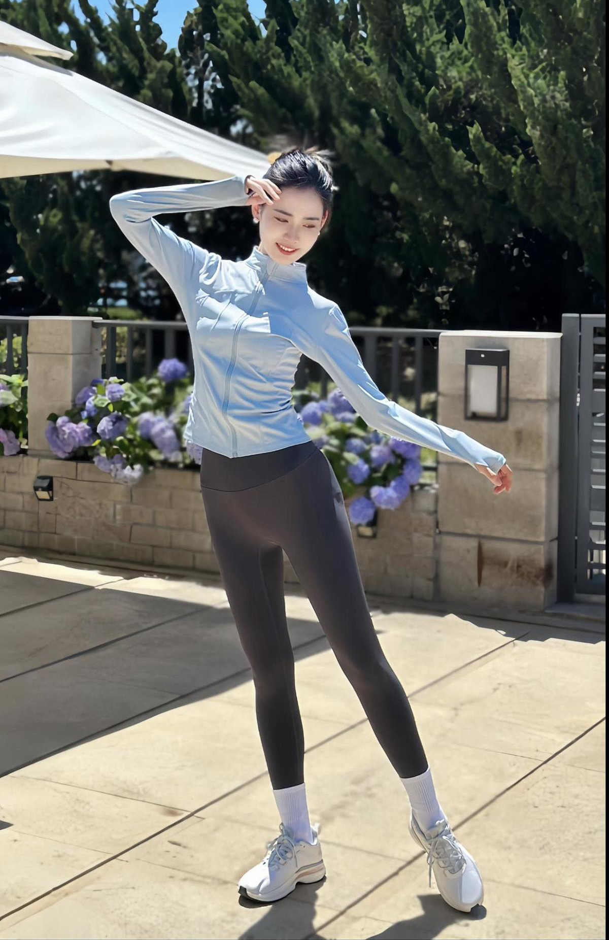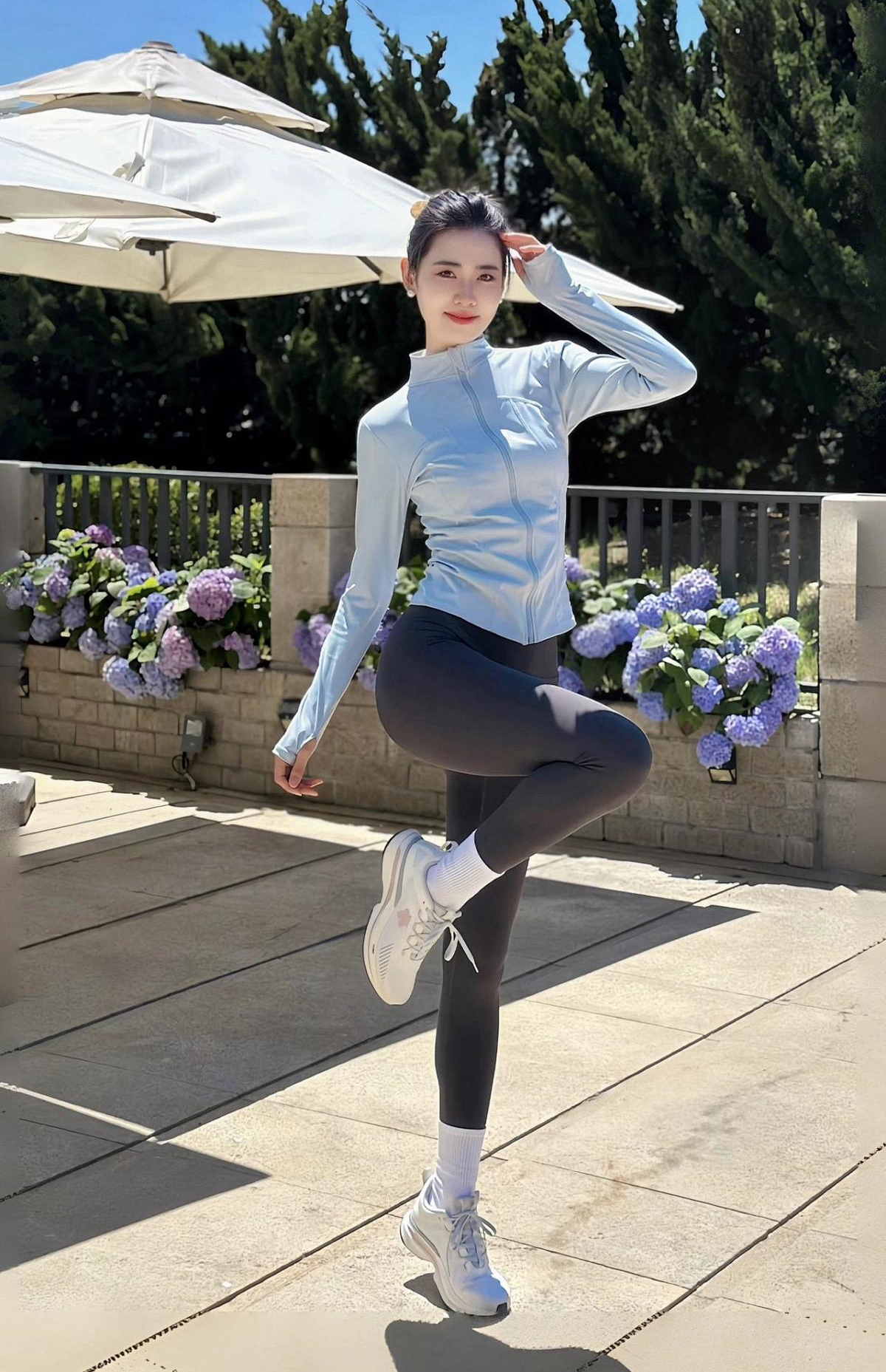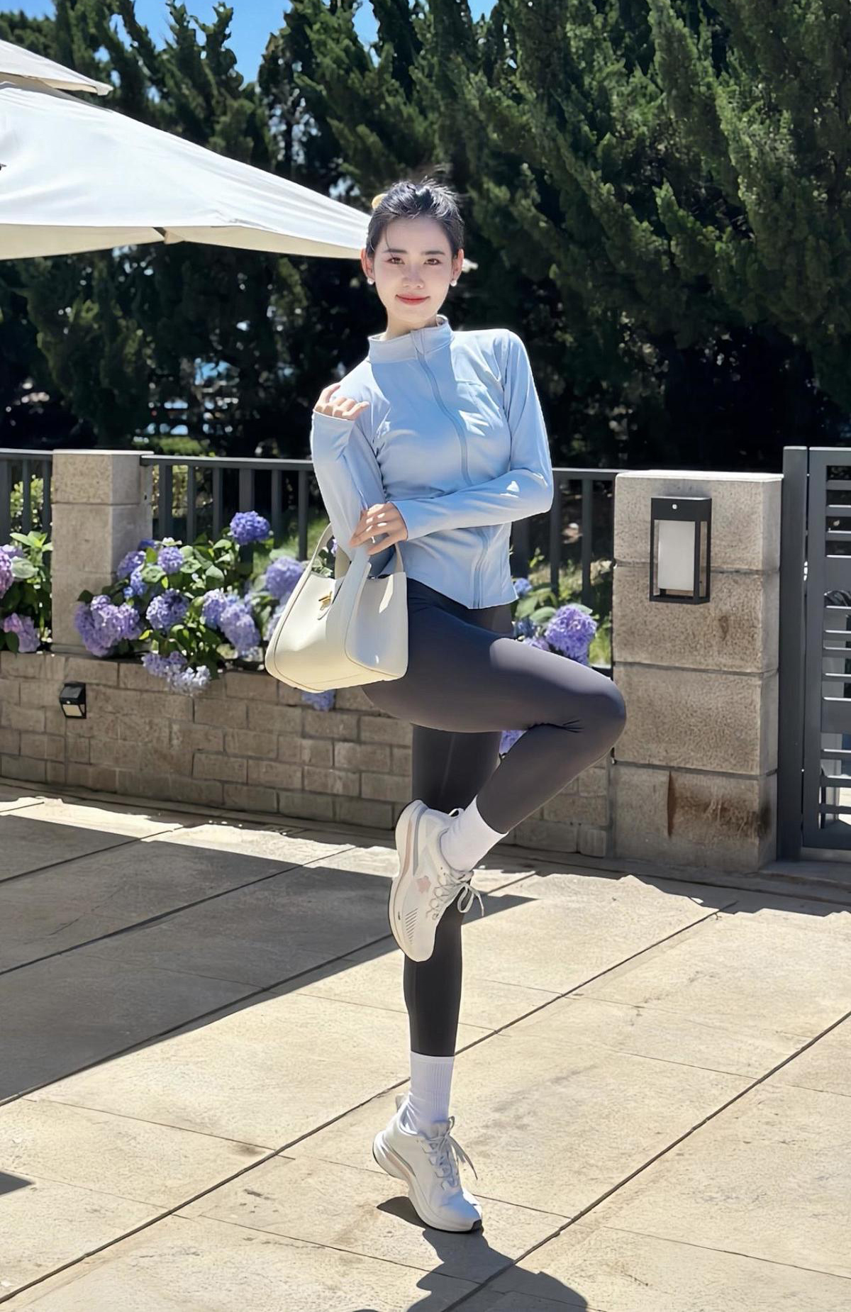 身材高挑纤长,紧身瑜伽裤清晰勾勒出笔直匀称的双腿线条,极具视觉延伸感。浅蓝色修身针织衫轻盈柔软,与黑色下装形成经典显瘦配