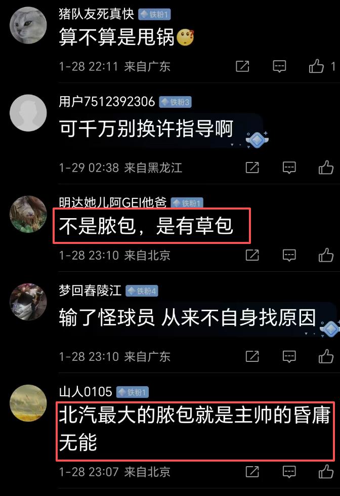 本场比赛,北京队多名主力表现拉胯,范子铭主打第四节,全场一分不得。杰曼全场8中1,只得到可怜的2分,陈盈俊6中2也只得到5分,难道许利民的口中所说的脓包是这些人?不过球迷并不相信许利民说的话,他们认为许利民是甩责的一种表现,并且指出脓包就是许利民。球迷说“一天天的阴阳别人,自己没能力带领好,这些话说一两次暗示挺好,一直说不太"、“不是脓包,是草包”、“北汽最大的脓包就是主帅的昏庸无能”。显而易见,这次球迷并不同情许利民,最大的脓包正是他自己。球迷直言,“要点脸的话自己赶紧辞职。球队最大的问题就是你许利民”。