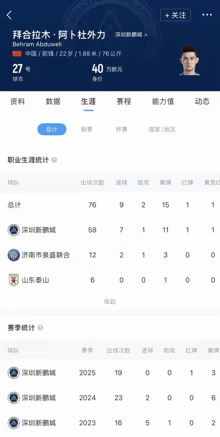 拜合拉木今年22岁,目前效力于深圳新鹏城。他在上赛季的中超联赛中出场19次,未能取得进球或助攻,表现并不突出。然而,他在国家队和U23国足的表现却十分亮眼。2025年,他代表国字号球队出战16场比赛,共打入7球,尤其在U23亚洲杯上帮助球队历史性地闯入决赛。这种国家队与俱乐部表现的明显反差,让他的未来去向备受关注。