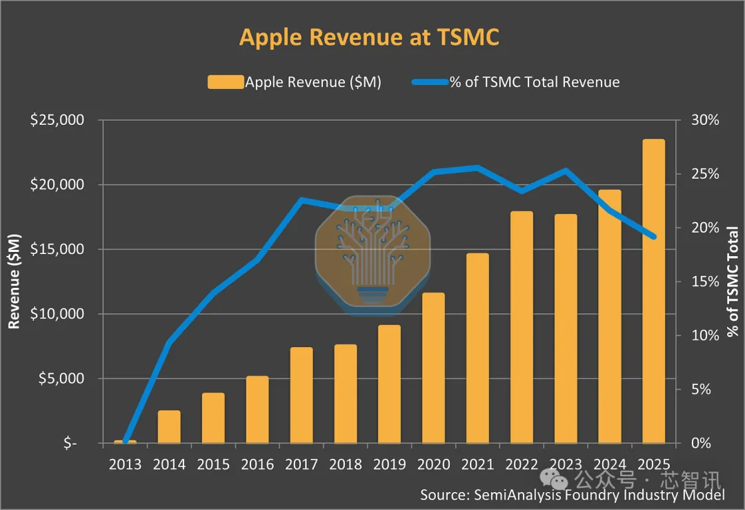 根据半导体研究机构Semianalysis的报告,苹果自2014年起通过早期承诺、大规模下单台积电的新制程之后,随即成为台积电全球最重要的单一大客户。这份关系的建立并非偶然,而是来自苹果愿意承担早期高昂成本、资助良率提升(Yield Improvements),并将其年度产品周期与台积电的技术蓝图(Roadmap)紧密结合所形成的。这种策略让台积电得以获得稳定的研发资金,进而超越竞争对手,巩固其在领先制程中的主导地位。