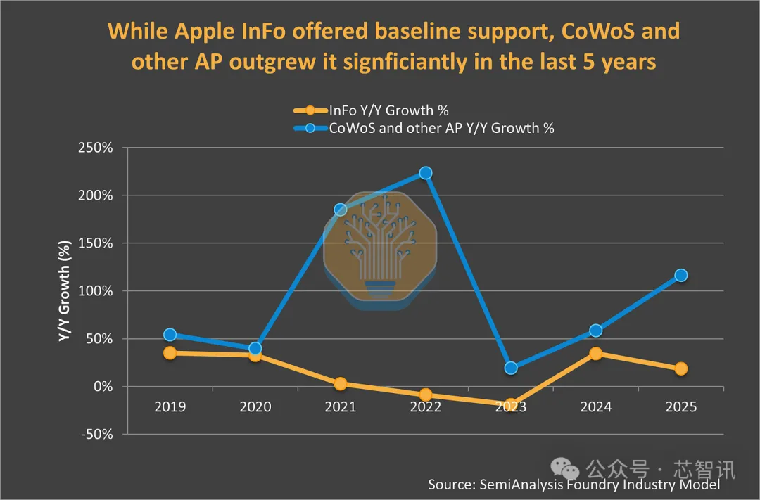 虽然苹果是首个大规模采用台积电先进封装技术的客户,其为台积电InFO先进封装服务带来的收入从 2018 年的 18 亿美元增长到 2024 年的 35 亿美元以上,这完全得益于苹果 A 系列和 M 系列芯片的推动。但台积电的 AI 封装平台 CoWoS 已经超越了它。在英伟达和 AMD 的强劲需求推动下,CoWoS 先进封装为台积电带来的收入在 2025 年达到了 96 亿美元,是 InFO 的 2.5 倍。