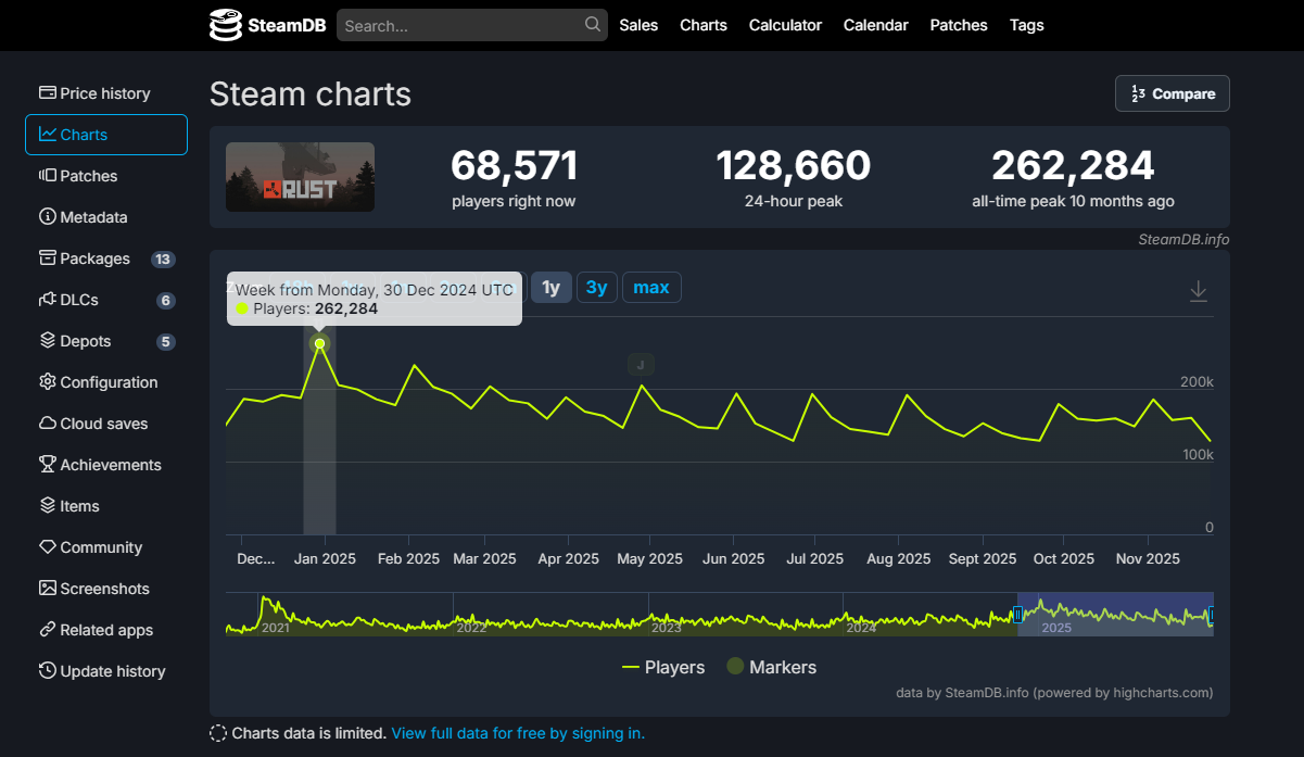 你肯定听过《Rust》这个名字,也应该知道这款上线超过12年的硬核生存游戏有多火:发售至今,《Rust》的销量已经超过2000万,在2025年年初有过高达26万人在线的纪录。据游戏时长统计网站HowLongToBeat的数据,《Rust》的人均游玩时长更高达270小时,对比同样知名的生存游戏,《七日杀》的平均游玩时长是60小时,《DayZ》是150小时,《Rust》可以说是远远胜出。