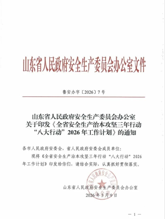 3月9日,山东省安委办印发安全生产治本攻坚三年行动“八大行动”2026年工作计划,明确负责人安全教育培训、重大隐患判定标准落地、隐患动态清零、安全科技支撑、从业人员素质提升、企业安全管理体系建设、精准执法帮扶、全民安全素质提升八大行动,聚焦智能化监管、隐患溯源治理、执法规范等,全面推进安全生产治本攻坚。