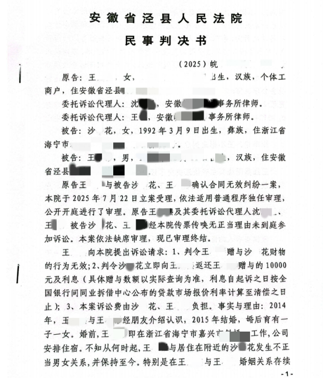 王女士还表示,自己曾作为王某贷款的担保人,并于2025年春节共同贷款30万元用于其公司发放工资。5月2日已工地买材料为由从其手机里套取5万网商贷,虽承诺月底还清,但截至目前只还了一小部分。王女士已对沙某花提起民事诉讼,要求返还相关夫妻共同财产。但沙某花庭审时未到庭,然而庭审结束后,却对王女士母子实施了言语威胁。她表示,对丈夫已无感情,仅希望依法维护自身权益。