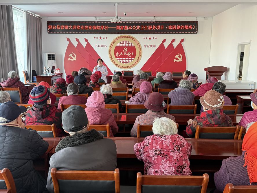 主讲人是索镇卫生院主治医师张翠。她通过朴实的方言,将家庭医生能做什么、怎么签约、有什么好处讲得明明白白。讲到高血压、糖尿病的日常管理时,台下不少人频频点头。