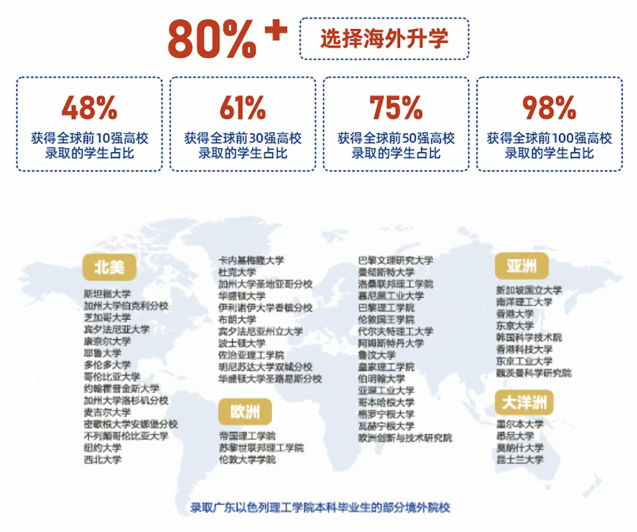 说到这里,大家最关心的肯定是实际培养效果。从数据来看,广以的表现很实在:2024届毕业生深造率超80%,48%被全球前10强高校录取,60%以上攻读研究型硕博项目,斯坦福、牛津、苏黎世联邦理工等顶尖学府都有它的毕业生;就业方面,毕业生多集中在珠三角的电子半导体、新能源、生物医药等领域,华为、宁德时代、埃克森美孚等企业都是主要雇主,研发与技术岗位占比超80%。