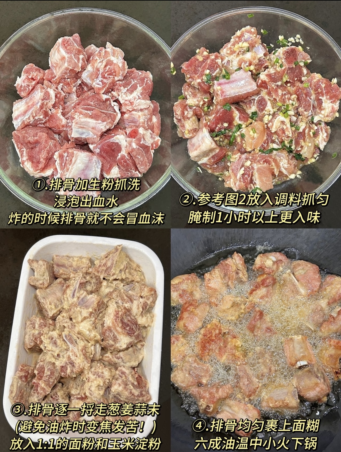 一切准备就绪,就可以开始炸制了。锅中倒入足量的食用油,油温烧至五成热时,将腌制好的排骨一块块放入锅中,中小火慢炸。炸至排骨表面金黄,用筷子能轻松扎透时,捞出沥油。这一步是为了让排骨熟透,同时形成酥脆的外皮。