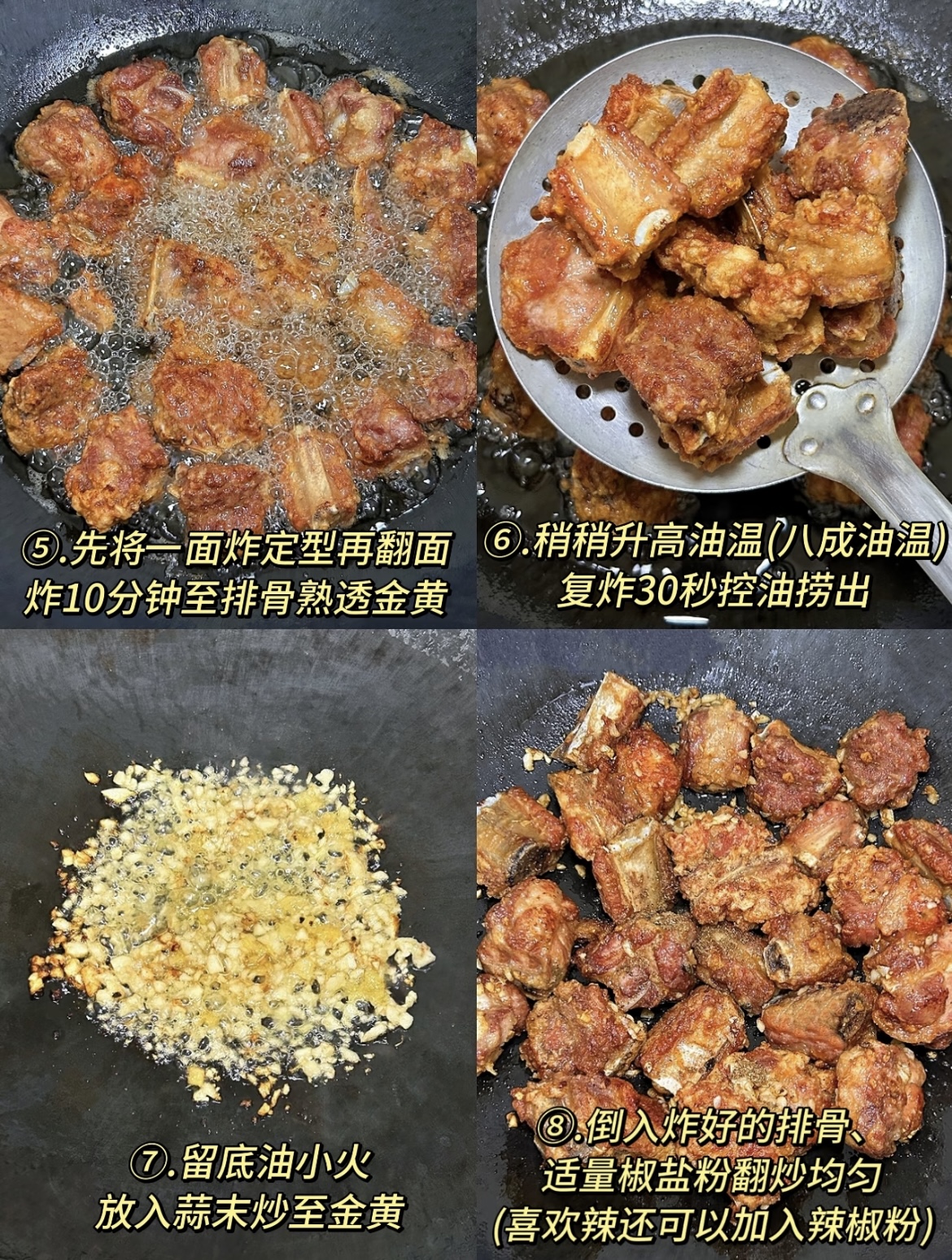 锅中留少许底油,下入预留的蒜末,小火煸炒出香味。然后,倒入炸好的排骨,快速翻炒均匀。最后,撒上适量的椒盐,翻炒几下,即可出锅装盘。