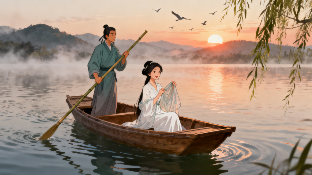 试想这样一个场景:夕阳西下,湖面如金,一叶扁舟缓缓划开涟漪。她卸下胭脂,素面朝天;他脱去冠带,布衣芒鞋。没有朝堂争斗,没有家国重担,只有风声、水声、心跳声。