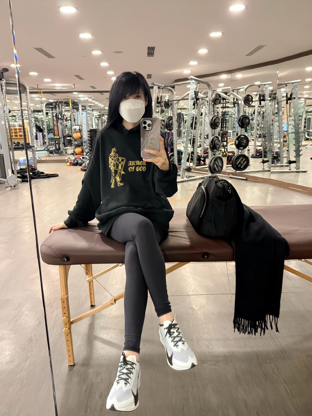 看背景她应该是在健身房,此刻的她坐在长椅上对镜拍照。
