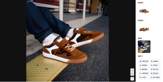 点击生成按钮,AI就会自动生成:鞋子上脚效果图、模特展示图,通常几秒到几十秒即可完成。