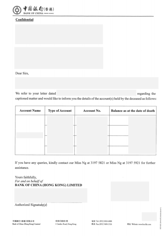 列明在港资产类型与价值,如银行存款、股票、房产等。如无法查明,则须当事人或香港律师与相应机构沟通查明。如当事人无法打印银行月结单确认银行存款余额时,须香港律师电邮银行,由银行查询并提供。