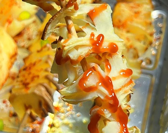 之后将土豆串在专用的长竹签上,缓慢而均匀地将其拉伸展开,形成完整的塔状结构。这一步需要一点耐心,动作轻柔才能保证造型完美。随后将成型的薯塔放入清水中浸泡片刻,目的是洗去表面多余的淀粉,这样炸出来的口感会更酥脆。捞出后务必用厨房纸巾彻底吸干水分,这是防止油炸时溅油的关键。