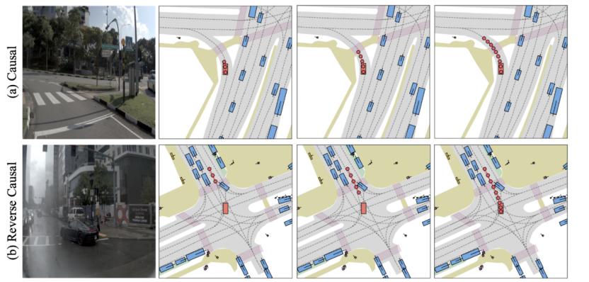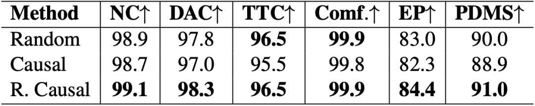 摆脱了「从左到右」的时序束缚后,模型该如何安排轨迹生成的优先级?WAM-Diff 深入探索了因果序(Causal)、反因果序(Reverse-Causal)和随机序(Random)三种解码调度策略。实验结果揭示了一个反直觉但极具价值的现象:反因果序策略在闭环指标上表现最佳。这意味着,先确定远处的终点状态,再倒推近处的轨迹细节,这种「以终为始」的生成逻辑能显著提升规划的一致性与安全性。这一发现从模型层面验证了人类驾驶员在复杂博弈场景下的直觉思维。