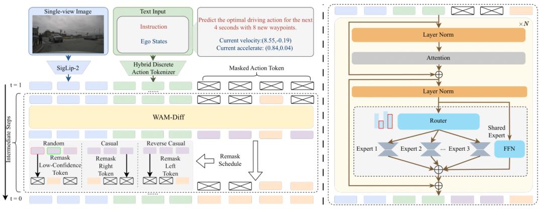 针对上述痛点,复旦大学与引望智能联合提出了 WAM-Diff 框架。该研究创新性地将离散掩码扩散模型(Discrete Masked Diffusion)引入 VLA 自动驾驶规划,并结合稀疏混合专家(MoE)架构与在线强化学习(GSPO),构建了一套不再受限于单向时序的生成式规划系统。
