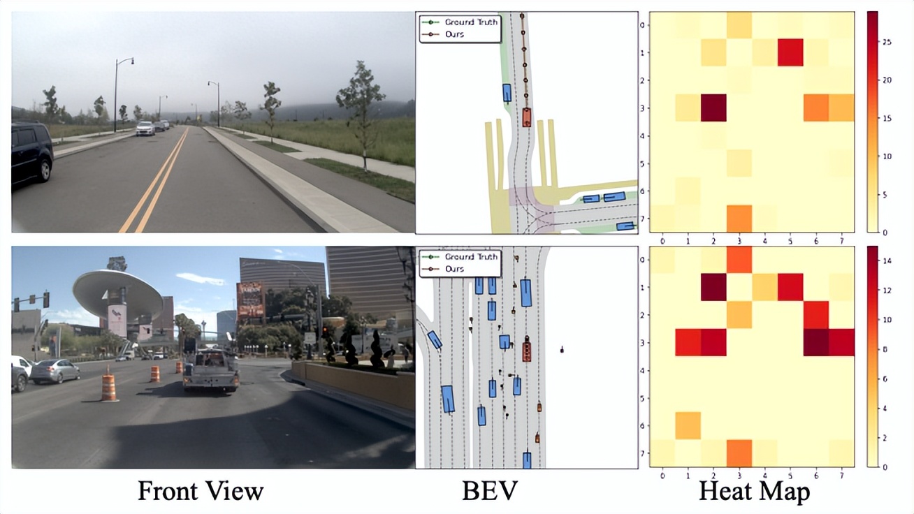 Figure 3 : MoE 组件的定性分析。不同场景下规划轨迹的 BEV 可视化与专家激活热力图。